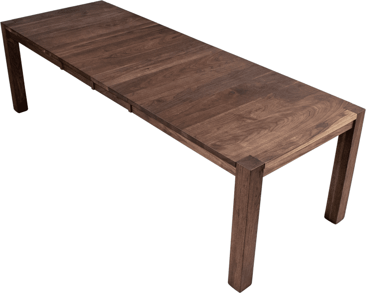 All of our walnut dining tables are made with solid walnut. Walnut is a highly sought after wood species because of its beautiful coloring. Typically blonder wood is from the younger sap wood at the outer edge of the tree and black walnut, the darker brown wood, is from the older heart wood at the center of the tree.