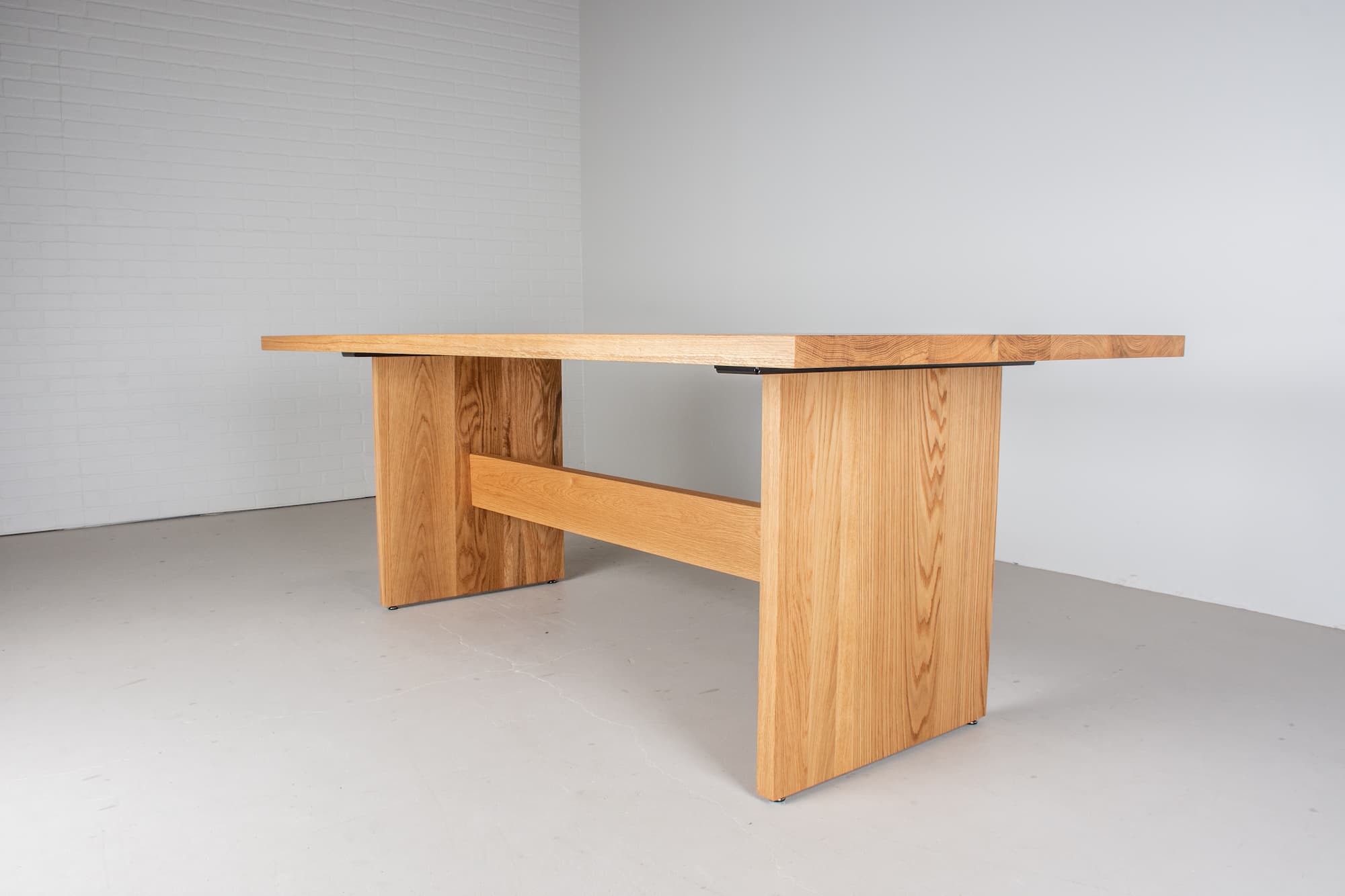 The Panuke trestle base is visually impressive and works well on large tables. Because there is a solid panel at each end which can potentially interfere with chairs and guests’ legs, you want to place them far enough from the ends so this is not an issue.This is why we recommend this base for large tables. On the sides, you will want to have enough space between the legs to place your chairs so that no one is sitting right at the panel leg.