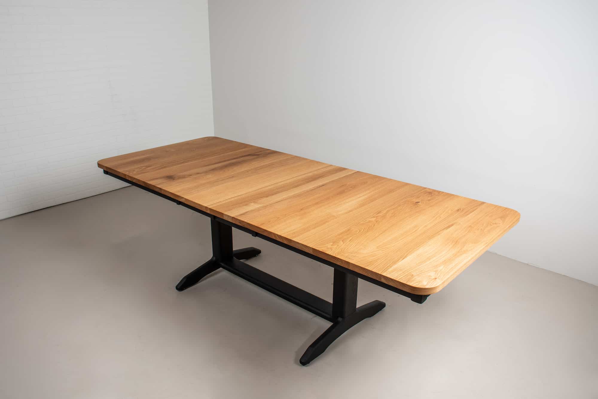 The tobin base has two T shape legs joined by a stringer. This wood base has a traditional feel to it. For consistency, the type of wood and the finish will be the same as the table top. The specifics of the size of the base will depend on the size of the top it’s paired with. These legs come with adjustable feet to help level the table.