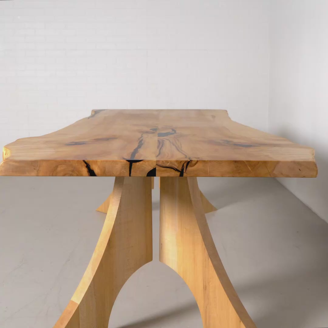 The Alta legs is a design that we really fell in love with since we first put them together. They show off a lot of wood, while staying nicely out of the way of chairs and legs. The bookmatch tops felt like a perfect pairing, showing off beautiful thick wood on top and below. The curve lets chairs slide overtop while still making the table solid. The functionality is great, and the looks are great. They’re made with the same thick wood as the table top, with the same wonderful character. Really an excellent pair.